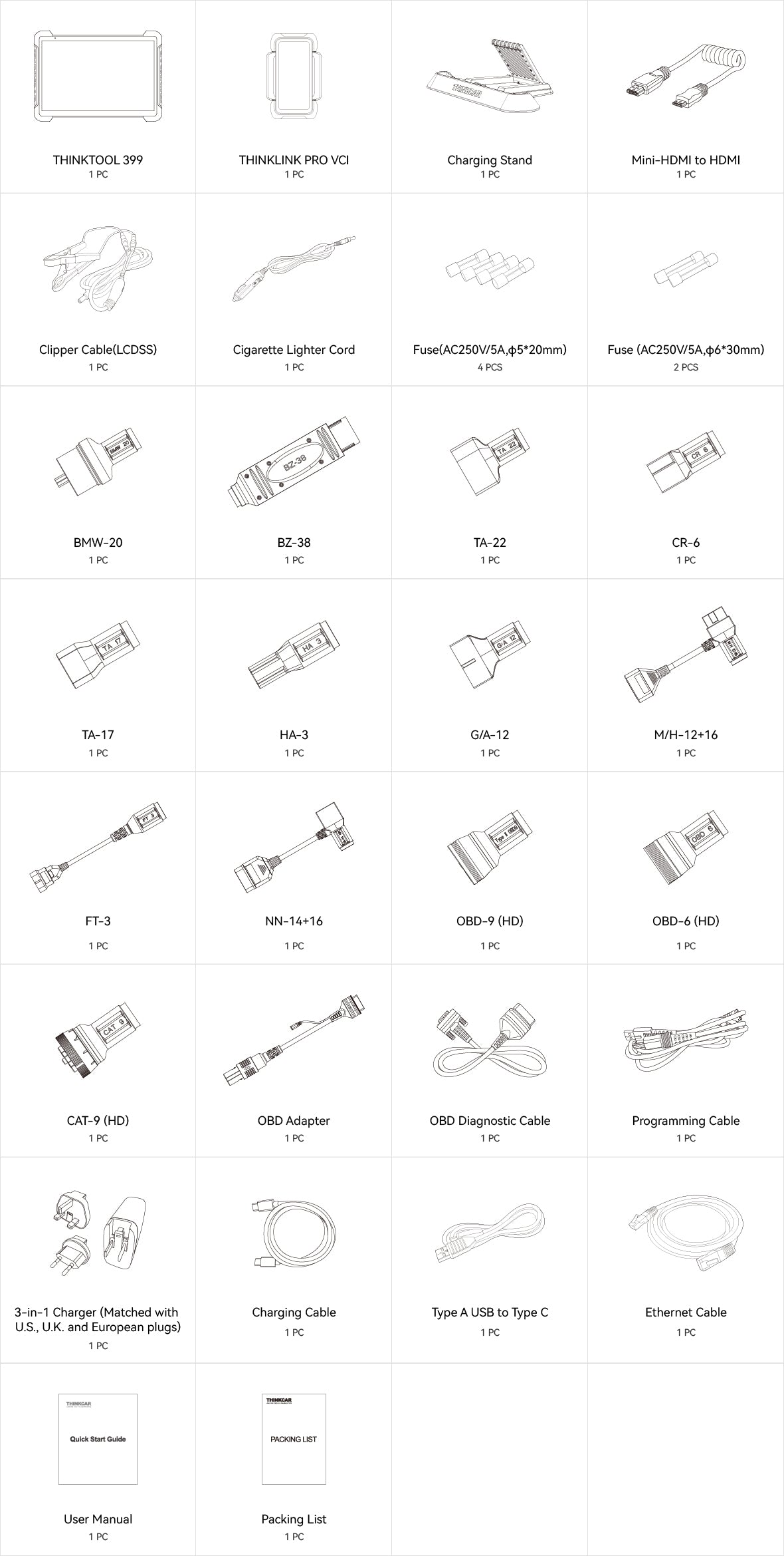 - Kompatibel med extra verktyg som Thinkeasy Bluetooth, Video Scope, Scope Box, THINKCAR TPMS Tool, PROG, TKey 101 och en skrivare.