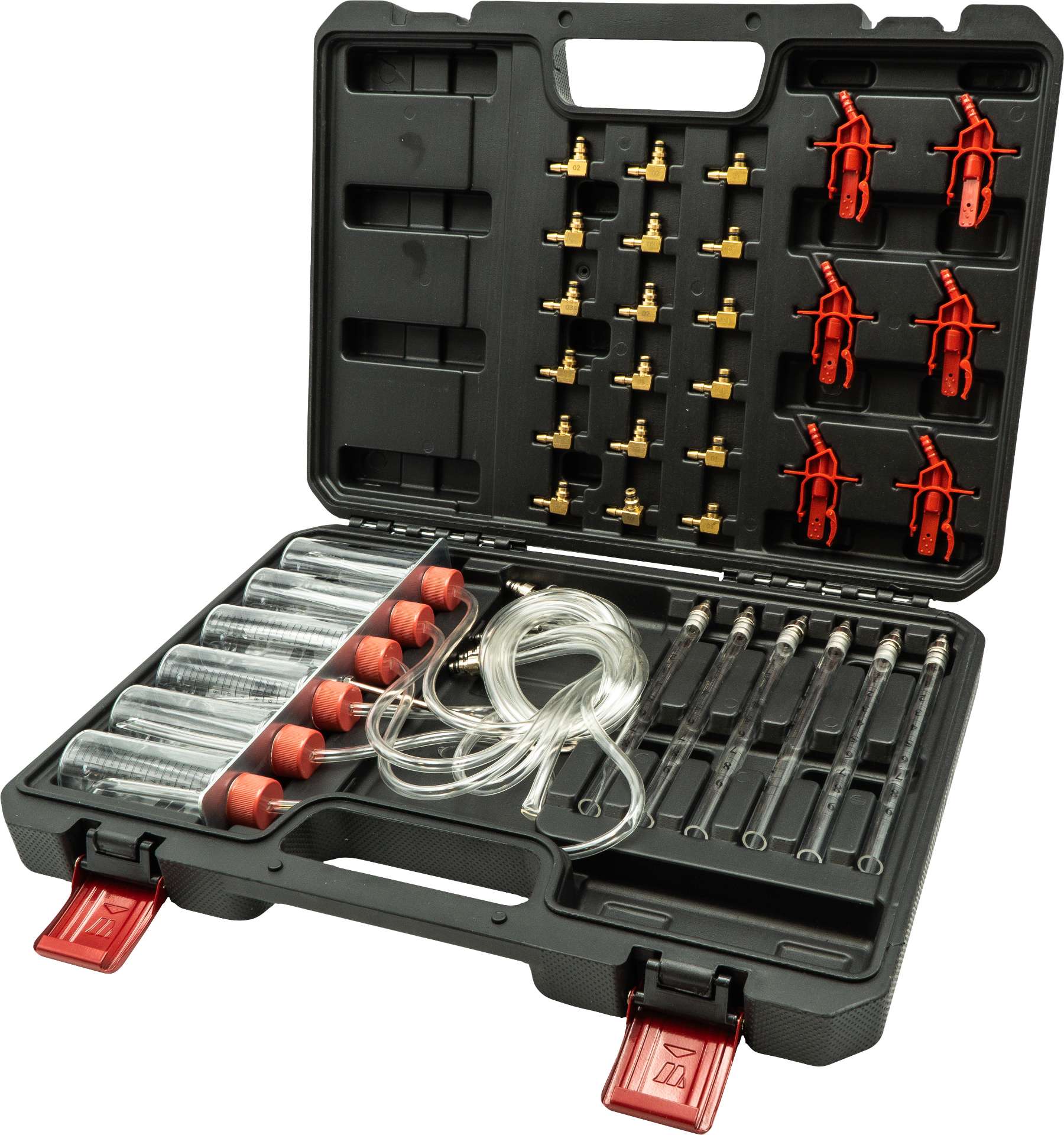 Testaren är utrustad med 6 glastuber och 6 mätpatroner med 70 cm anslutningsslangar, vilket möjliggör exakt mätning av returflödet. Denna noggrannhet säkerställer tillförlitlig diagnostik och hjälper till att identifiera eventuella problem med injektorerna.